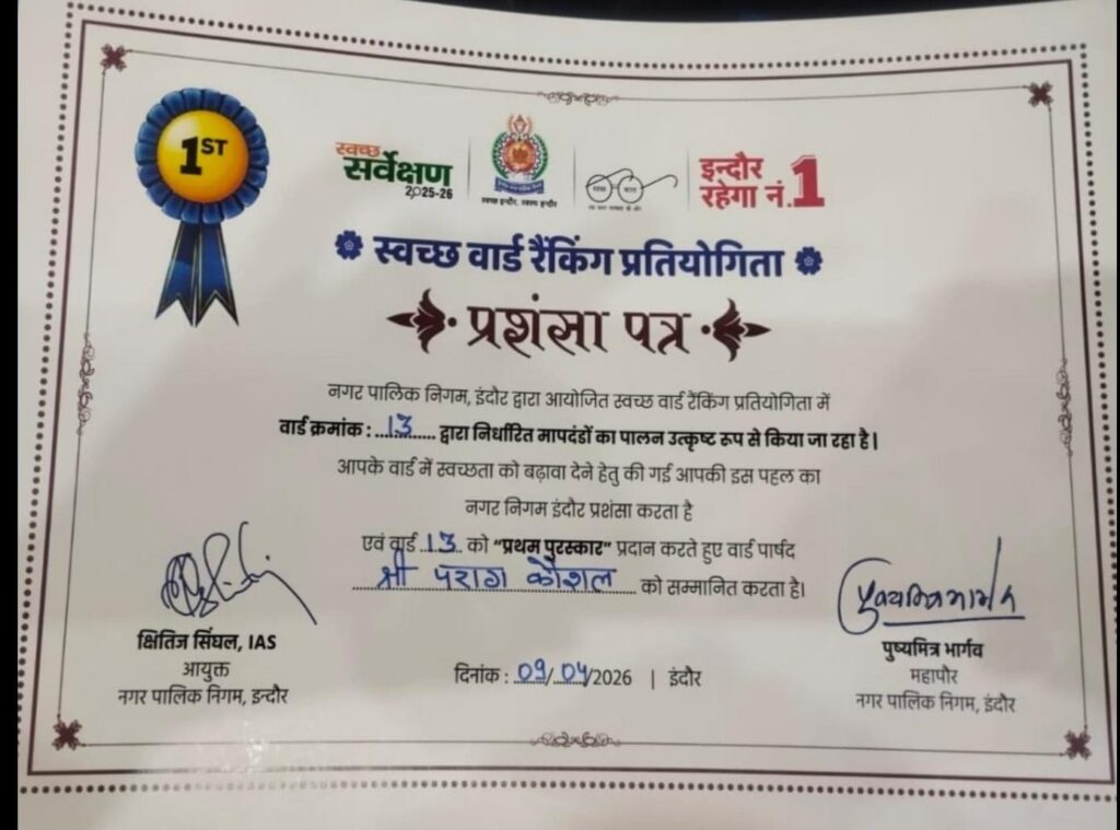 स्वच्छ इंदौर वार्ड रैंकिंग 2025-26: वार्ड 13 के पार्षद पराग कौशल ने प्रथम स्थान हासिल किया